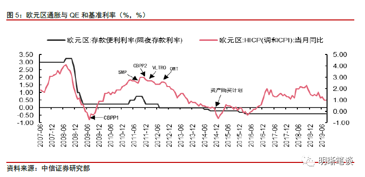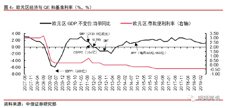 此次的宽松政策组合,历史上欧央行基本上都曾经实行过,因此为了判断此次QE和降息对于欧元区经济、资产价格的影响,我们需要回顾历史,从历史的角度来看欧央行实行宽松的货币政策之后,欧元区经济、通胀和资产价格的后续反应。