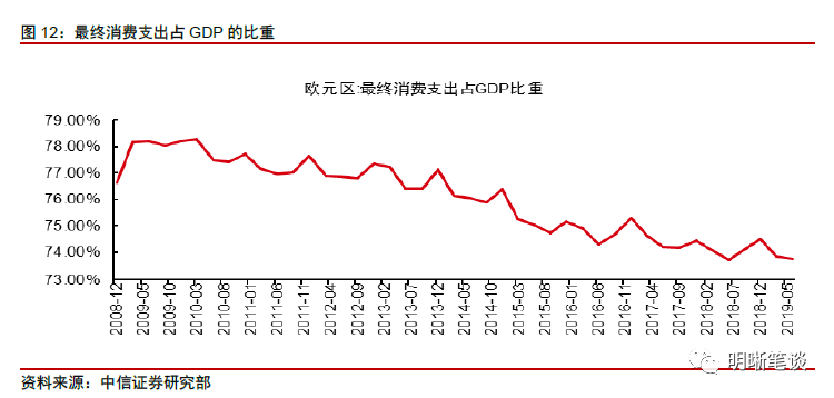 因为欧元区居民部门和政府部门需求弱,导致企业无利可图,自然没有动机借钱再投资。居民、政府和企业部门是互相联系的,而且容易形成正反馈的循环。当政府部门需求下降,企业部门的收入就会下降,企业部门收入下降会导致居民部门收入下降以及政府税收下降,居民收入下降又会导致政府税收和企业收入下降,导致恶性循环。而欧元区GDP中比重最大的就是最终消费支出,疲弱的居民需求和政府需求,导致企业无利可图,缺乏扩大再生产的动机。