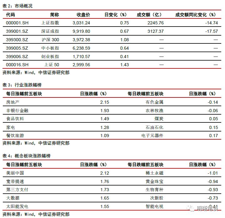 2019年9月12日,银存间质押式回购加权利率大体下行,隔夜、7天、14天、21天和1个月分别变动了-10.08bps、2.12bps、9.08bps、-6.24bps和-1.81bps至2.45%、2.64%、2.73%、2.66%和2.90%。国债到期收益率涨跌互现,1年、3年、5年、10年分别变动-0.81bps、0.55bps、-0.29bps、1.00bps至2.61%、2.75%、2.95%、3.05%。上证综指下跌0.41%至3008.81,深证成指下跌1.12%至9853.72,创业板指下跌1.26%至1,703.54。