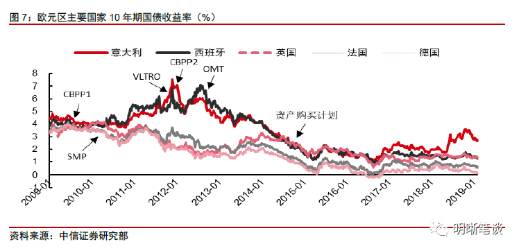 为提振经济,欧洲2015年曾实施资产购买计划,时间长达4年,总规模约2.6万亿欧元。量化宽松政策的原理为:中央银行制造货币,然后从金融机构购买债券,金融机构从而降低利率,导致企业和个人增加借贷,从而增加消费和制造就业,最终达到刺激经济的目的。