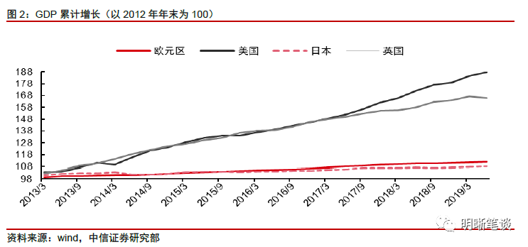 QE对经济的刺激效果越来越弱。在2011-2012年期间,在欧央行实行多种QE政策之后,通过购买主权债券对债务国财政予以大力支持,成功帮助各债务国逐渐走出衰退,经济在2013年开始回升。但是2015年初开始的资产购买计划(每月购买规模在600亿欧元-800亿欧元),购买的规模以及持续的时间都是前所未有的,从2014年底到2018年底结束,欧央行持有的证券资产规模累计增加约2.6万亿欧元,虽然这一轮QE的力度前所未有,但是对于经济的刺激力度很小,效果远不如2011年至2013年的小规模QE。