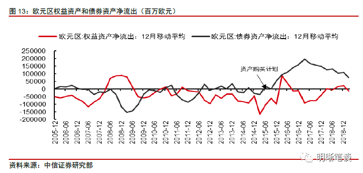 2015年欧央行开启资产购买计划后,欧元区资金外流,主要流向是从欧元区的债券市场流向其他国家债券市场。2015年初欧央行开启资产购买计划后,欧元区权益资产和债券资产的净流出速度开始加快,其中债券资产的净流出规模远大于权益资产,而且从持续时间来看,债券市场的净流出持续的时间也更久。从绝对量来看,欧元区权益资产的资金净流出并不明显,大部分时间权益资产都是处于净流入的状态,因此欧央行开启资产购买计划之后,对全球的债券市场的存在促进作用。