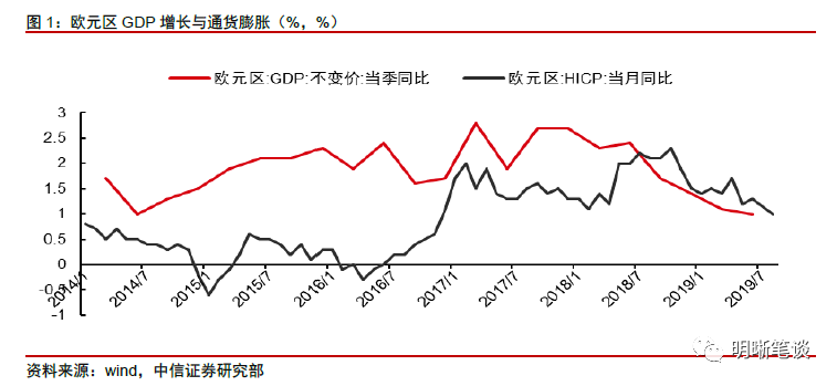 但是目前来看,传统的债务周期在欧元区似乎已经失效,目前货币政策陷入了困境。欧央行自2008年金融危机后,大幅度降低政策利率,使得经济和通胀迎来了短暂的反弹,但是经济和通胀的反弹不能持续,政策利率的下行空间有限,欧央行开始采用非常规的QE来进一步刺激经济发展和通胀,经济和通胀又迎来短暂的反弹,但是反弹一段时间后又开始了下行,于是欧央行采取更大规模的资产购买计划来刺激经济,但是QE的效果并不理想,通胀一直处于2%的目标以下,经济增速也反应不大,直到2019年二季度,欧元区经济再次出现了下滑的迹象,欧央行重新启动QE以及小幅度的加深政策负利率的程度来刺激经济和疲软的通胀。