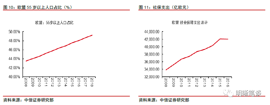 对于居民部门而言,居民住房贷款利率以及其他贷款利率一直都在下行,但是居民却一直在去杠杆,原因是复杂的。第一点,就是人口老龄化加剧,欧盟55岁以上的人口占比已经接近50%,呈现快速上升的趋势,从绝对数量来看25-55岁年龄阶段的人数近些年一直在减少,人口老龄化以及劳动力数量的减少,造成了欧洲内部需求的疲软,导致了低欲望社会;第二点,与社会文化有关,欧洲的社会福利较好,每年社保支出占GDP 20%左右,大家享受安逸的生活,风险偏好低,融资需求弱。除了这两点外,还有很多其它的因素。