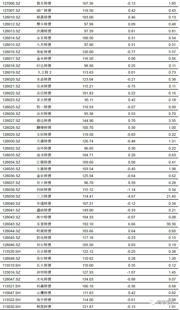 9月12日转债市场,平价指数收于95.02点,上涨0.63%,转债指数收于113.34点,上涨0.08%。176支上市可交易转债,九洲转债今日上市,除华源转债、鼎胜转债、迪森转债、金禾转债、江银转债、无锡转债、富祥转债横盘外,84支上涨,84支下跌。其中,东音转债(6.66%)、格力转债(4.02%)、蓝标转债(3.43%)领涨,三力转债(-4.67%)、岱勒转债(-3.91%)、凯龙转债(-1.86%)领跌。176支可转债正股,除雅化集团、海印股份、上海电气、九州通、哈尔斯横盘外,120支上涨,51支下跌。其中,东音股份(6.80%)、中来股份(6.28%)、泰晶科技(5.43%)领涨,岱勒新材(-6.18%)、创维数字(-4.64%)、三力士(-3.75%)领跌。
