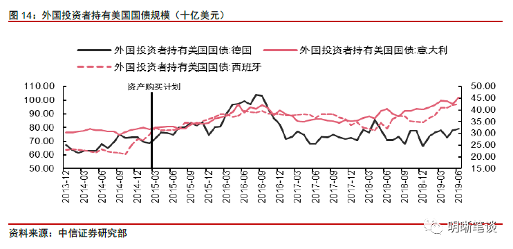 2015年欧央行开启资产购买计划之后,欧元区的国家对美债的持有量迅速上升。欧元区实行资产购买计划后,债券市场投资者考虑到未来欧元可能会贬值以及国外较高的收益率,因此欧元区债券市场的资金大规模的购买境外的债券,尤其是美国的国债。