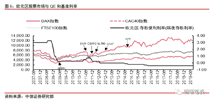 QE对于股票价格的促进很明显。低利率的环境以及大规模的QE,为市场提供了很多的流动性,这些流动性大部分没有流入实体促进经济以及通胀,更多的流入了金融资产中,是欧洲主要国家的股票市场一直保持上升趋势的重要原因。