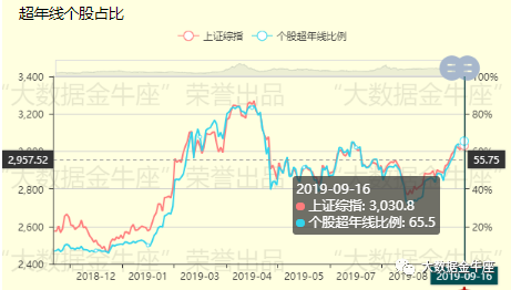 - 千算万算,算不到沙特油厂被轰炸。 所以说:黑天鹅时常有,今年特别多。 大致看一下今天的数据: 在“大数据金牛座”公众号中输入“大盘”,我们看到今天的个股超年线比例是65.5%,创出了本轮反弹的新高