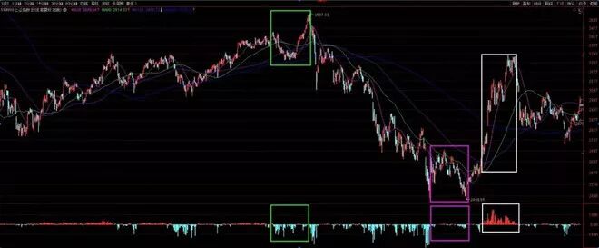上图出现过两个明显的背离迹象,我用绿色框标注处,指数明显创新高,但是当时市场赚钱效应并不好,下方红色堆并没有明显出现,甚至还是绿色堆较多,记得当时主要是石油、银行等超级大蓝筹指标权重股拉升,虚假的指数繁荣下,确实很多股不涨反跌,那段时期明显赚指数不赚钱,指数掩盖资金出逃,可以看做诱多。2018年10月至2019年1月创2440新低期间,我用紫色框标注的地方,并没有向2018年2月至10月期间出现明显绿堆亏钱效应,因为那时主要是权重股砸盘拉低指数,很多个股并不跟跌,可以看作是诱空,这也是一个背离迹象。