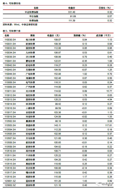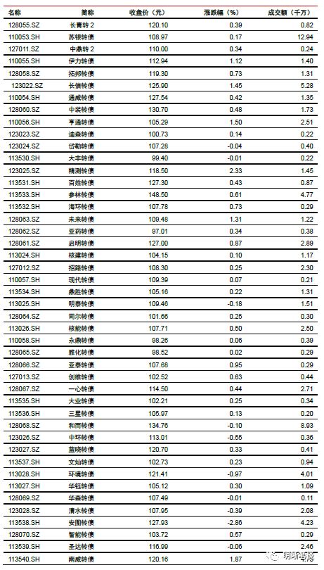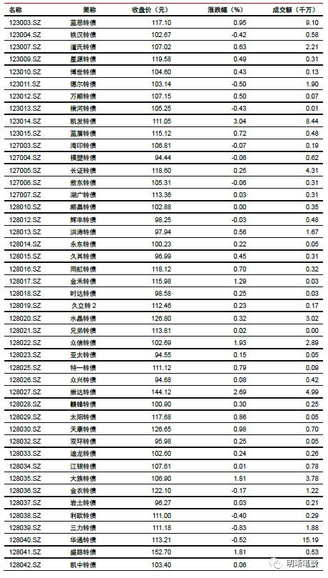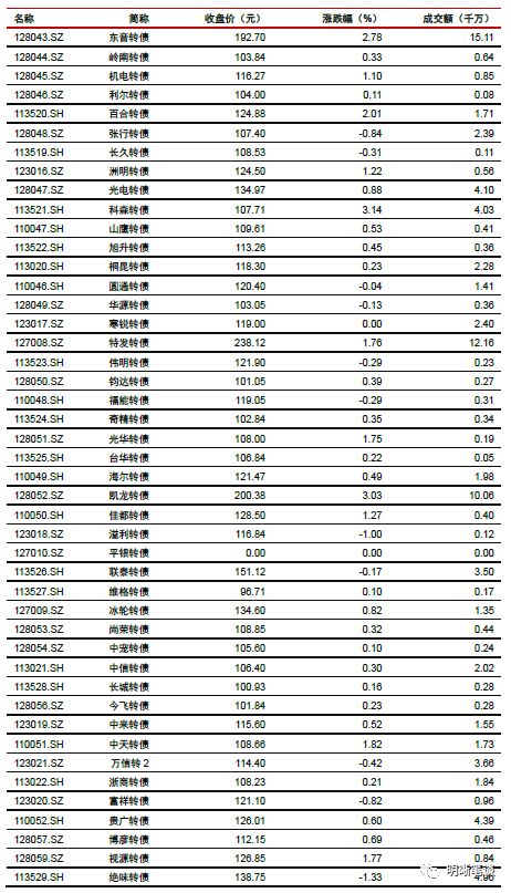 9月19日转债市场,平价指数收于91.89点,上涨0.57%,转债指数收于111.39点,上涨0.32%。178支上市可交易转债,除平银转债、寒锐转债、吉视传媒横盘外,131支上涨,44支下跌。其中,科森转债(3.14%)、凯发转债(3.04%)、凯龙转债(3.03%)领涨,安图转债(-2.86%)、绝味转债(-1.33%)、溢利转债(-1.00%)领跌。178支可转债正股,除合兴包装、明泰铝业、长久物流、德尔股份、岭南股份、吉视传媒横盘外,144支上涨,28支下跌。其中,凯发电气(10.03%)、科森科技(10.01%)、众信旅游(8.41%)领涨,上海环境(-5.77%)、铁汉生态(-2.85%)、清水源(-2.42%)领跌。
