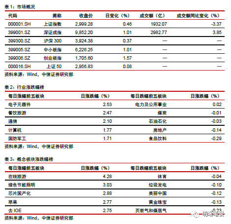 2019年9月19日,银存间质押式回购加权利率整体上行,隔夜、7天、14天、21天和1个月分别变动了10.47bps、7.33bps、10.31bps、10.05bps和8.16bps至2.64%、2.66%、2.67%、2.90%和2.90%。国债到期收益率涨跌互现,1年、3年、5年、10年分别变动0.04bps、0.04bps、-0.56bps、-2.25bps至2.55%、2.75%、3.00%、3.11%。上证综指上涨0.46%至2,999.28,深证成指上涨1.01%至9,852.20,创业板指上涨1.57%至1,705.60。