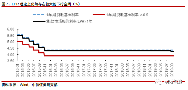 在LPR新报价机制下,MLF与LPR的利差也并非恒定不变,月度报价会根据资金成本、市场供求和风险溢价等因素定价。LPR首次报价下行幅度小,当前1年LPR报价4.25%,与1年期MLF操作利率利差仍然在95bps,与1年期贷款基准利率9折的3.915%利差仍有33.5bps。理论上1年LPR与1年期MLF利率利差仍然存在最大33.5bps的压缩空间。因而在动用降息工具前,仍然可以通过进一步压缩LPR与MLF利率的利差的方式来引导贷款利率下行。根据央行公告,9月全面降准可以降低银行成本150亿元左右,预计9月20日新LPR第二次报价利率将会继续下行5~10bps。