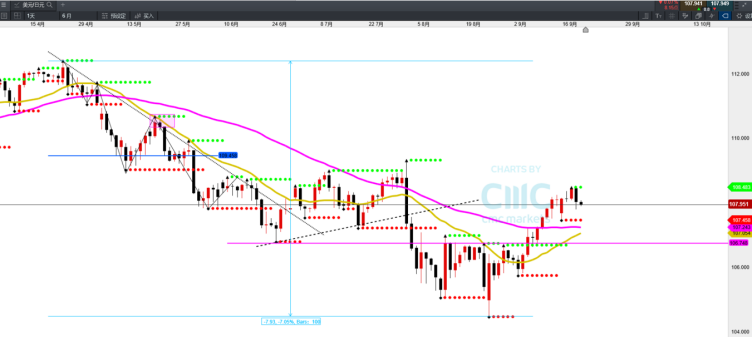 日元(JPY)短期卖压已经呈现,此前9月5日上破106.7以来的反弹波段暂时告一段落,卖压出现于108.44水平区域,短期支撑水平留意107.4水平附近,短期有回撤需求,中线波段投资者留意支撑位且日线M21金叉M55水平后的共振区域。