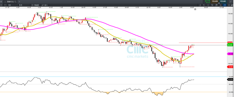 英镑交叉盘上,英镑日元(GBPJPY),借力英镑汇价上行延续强势反弹态势,汇价卖压留意136.28—136.35水平区域,短期支撑水平133.8—133.3水平区域。