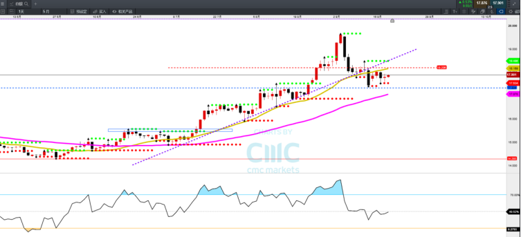 白银(Silver)技术上对于上周五(9月13日)近光脚中阴线呈现内孕线组合结构,日线RSI位于50%水平附近,回调水平确认,有望再度上试18.206—18.49美元水平区域。