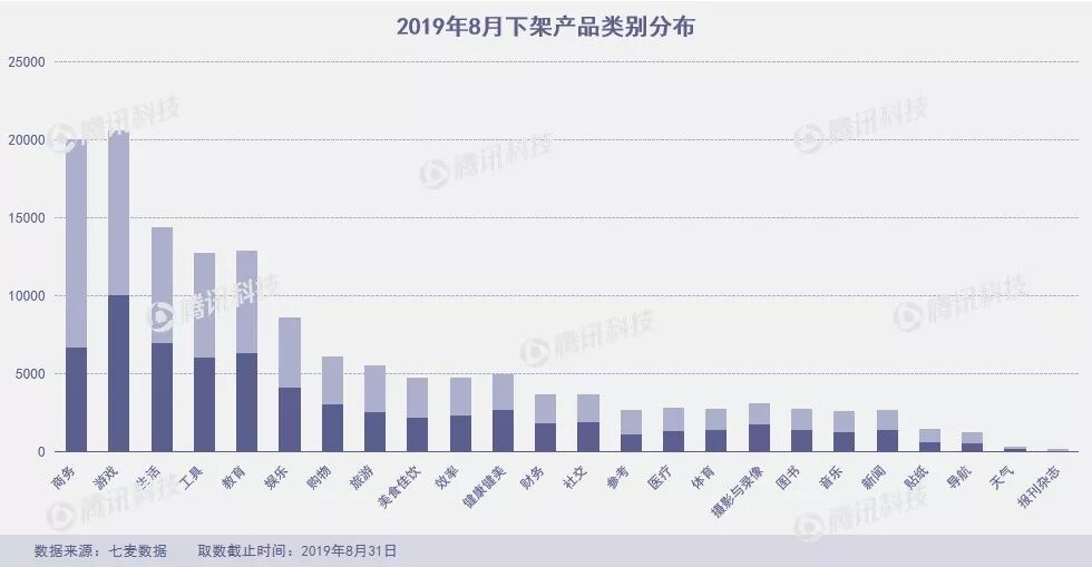 8月,App Store下架7.7万款产品,比7月份产品下架数量增加约一万款。其中,商务和游戏类产品下架数量最多,均达1万余款。