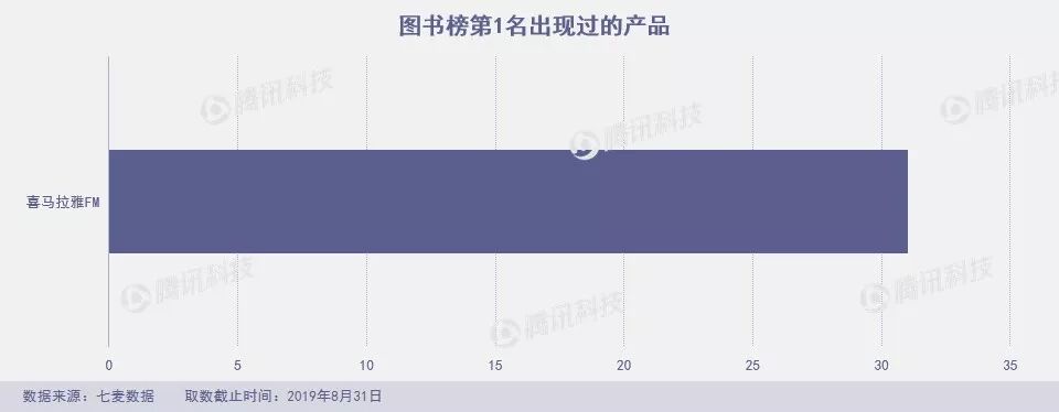 8月,20款产品占据图书榜Top 10,其中,喜马拉雅连续31天霸榜8月图书榜第1名。