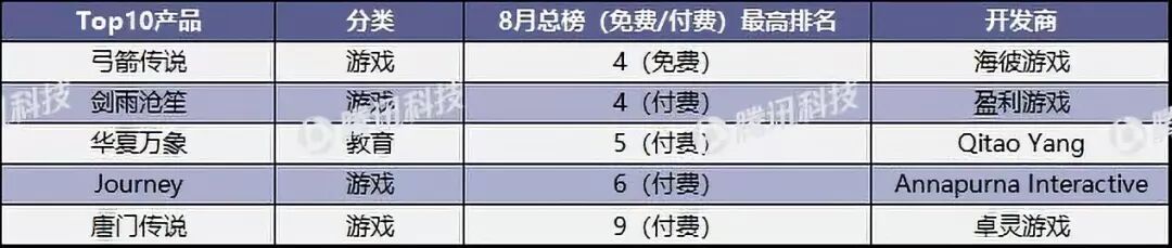 8月份,总榜Top 10共出现过43款产品,其中游戏和摄影类分别占据15款和6款。