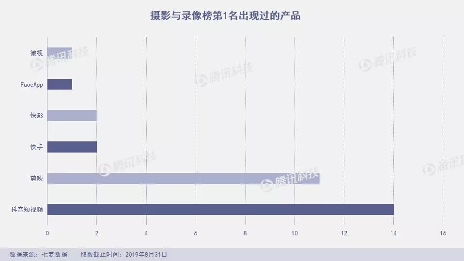 18款产品承包8月份摄影与录像榜单,其中快手极速版在摄影榜Top 10出现13天。