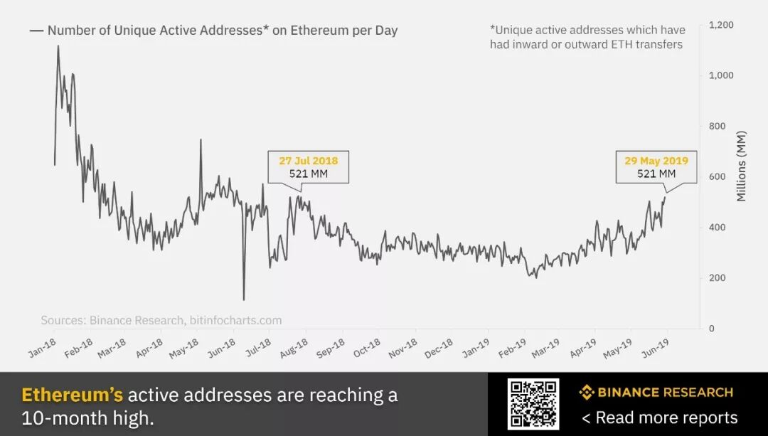 以太坊网络的日活跃地址数也达到了10个月以来的新高。见下图: