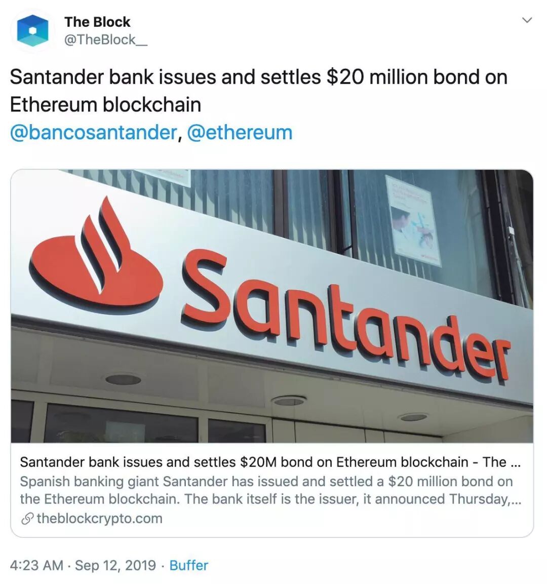 近日,桑坦德银行宣布在以太坊区块链上发行价值2,000万美元的债券;Harbor近期宣布在以太坊上发行价值1亿美元的房地产基金代币;全球最大区块链支付提供商BitPay 宣布支持ETH...