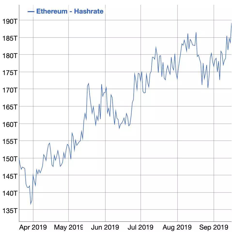 在过去6个月,以太坊网络的哈希率(算力)在持续提高,见下图。这意味着,尽管以太坊网络挖矿的未来存在不明朗的状态 (包括ProgPoW是否会实施,以及Eth2.0的到来),但当前以太坊网络的矿工仍看涨ETH价格。