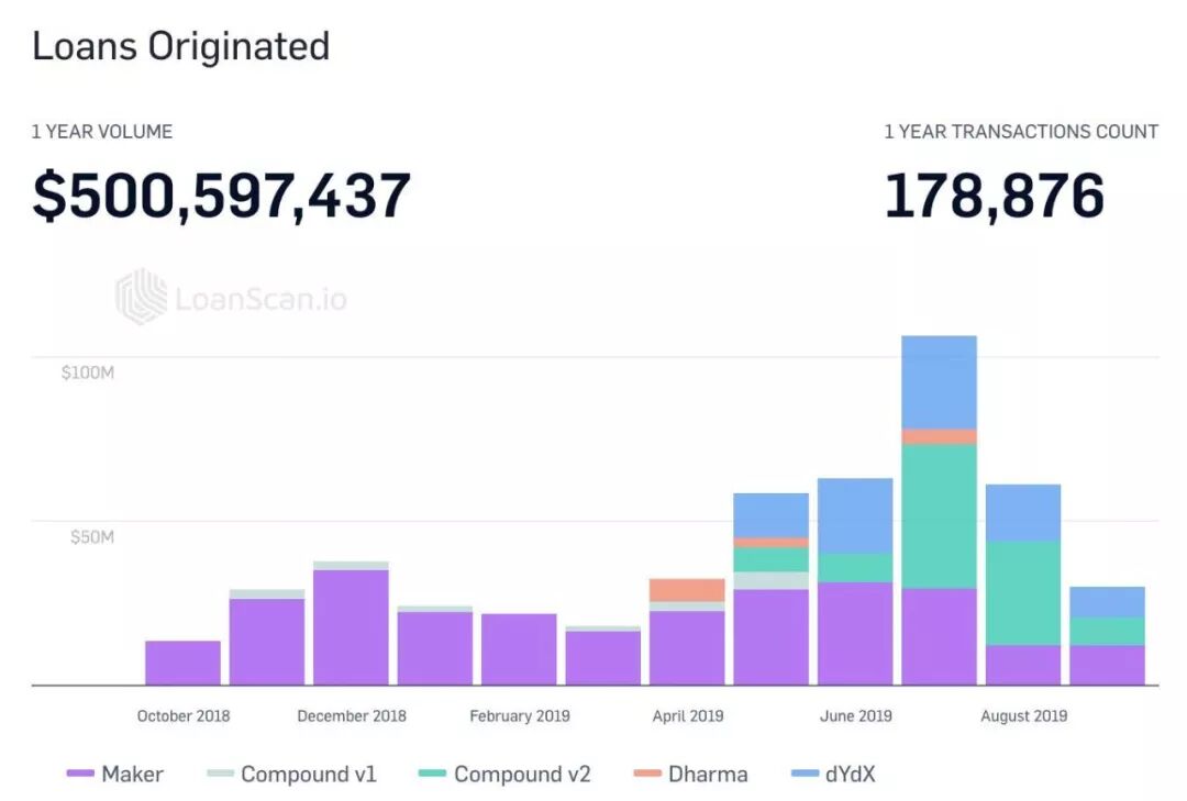 截至当前,所有DeFi协议共计发放的贷款超过了5亿美元,这是一个重要的里程碑。见下图: