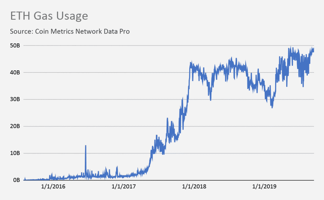 与此同时,以太坊的Gas日消耗量也在最近上涨到了历史峰值,见下图。Coin Metrics 认为这很有可能是由于最近基于以太坊的USDT交易量的上升而推动的。