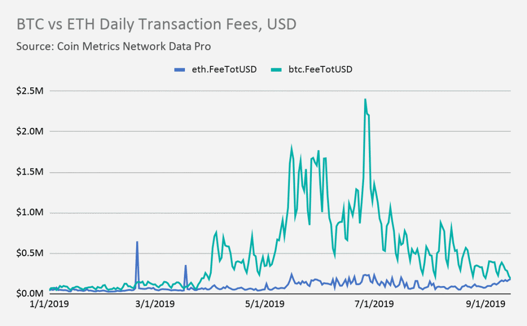 根据Coin Metrics的数据,当前ETH日交易费正在赶超BTC:截至2019年9月15日,以太坊网络中的ETH日交易费达到182,899美元,比特币网络中的BTC日交易费为185,993美元,二者非常接近。见下图: