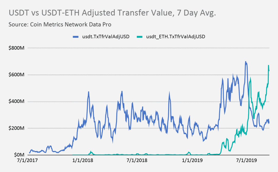 从图中可以看出,2019年的大部分时间里,基于比特币的USDT的日交易量 (蓝线) 都在增长,甚至在2019年8月7日达到了有史以来最高的日交易量。但自那以后,基于以太坊的USDT的日交易量 (绿线) 就不断飙升,并于2019年9月9日达到了峰值。