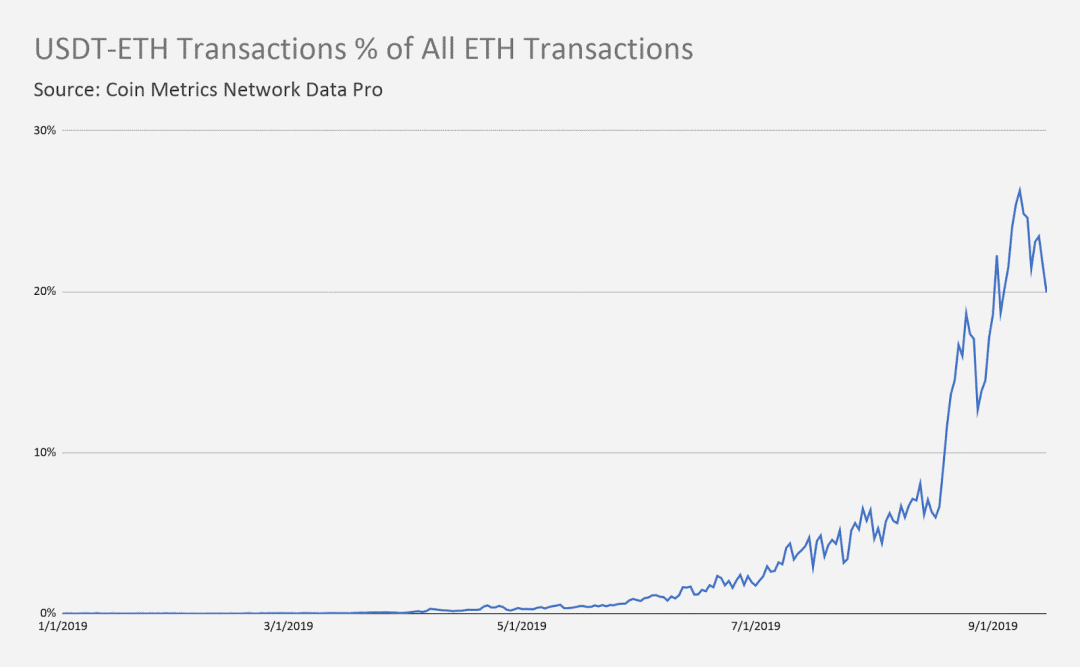 实际上,基于以太坊的USDT交易量正在不断增长,并在9月8日占据了所有以太坊网络交易量的25%以上。在2019年8月中旬以来,基于以太坊的USDT交易量一直占据着以太坊网络日交易总量的10%以上,见下图: