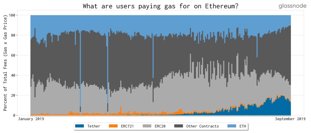 但实际上,正如上文Coin Metrics的数据显示,USDT的交易量仅占据以太坊网络20%左右。这与下图Glassnode的数据相吻合:当前以太坊网络中Tether (USDT) 交易使用的Gas量占比 (深蓝色) 仅有20%左右,相比之下,ETH交易使用的Gas占比 (浅蓝色) 更小,占比最大的是除Tether、ERC721、ERC20和ETH之外的其他智能合约的Gas消耗。