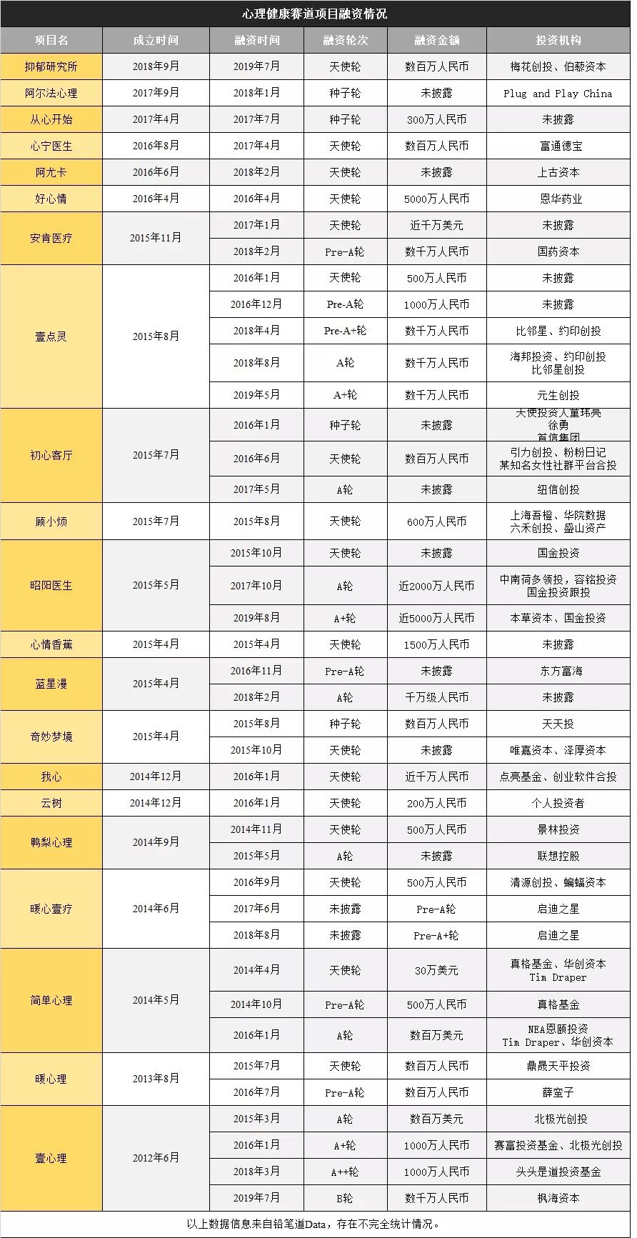 除了壹心理,今年5月,壹点灵完成A+轮数千万人民币融资;7月,抑郁研究所获投数百万,资方为梅花天使、伯藜资本;8月,昭阳医生宣布完成近5000万元A2轮融资,本草资本领投,国金投资跟投。
