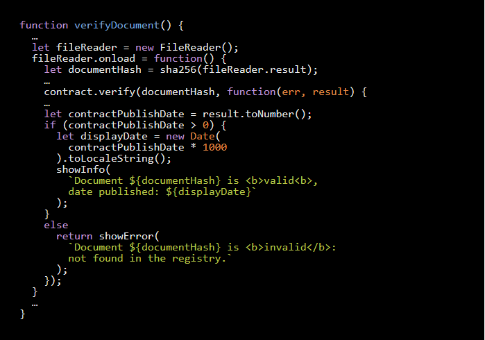 这次我没有从头开始编写合约代码。因为我一般不会做重复的工作,而区块链注册表已经被创建过十几次了。谷歌一键搜索就能找到 GitHub repo(https://github.com/nakov/Ethereum-Web3-Document-Registry-Demo),我将用它来展示该模型是如何运作的。即使它使用的是老版的solidity,它仍然可以很好的工作,而且你可以自己测试一下(感谢Svetlin!)。