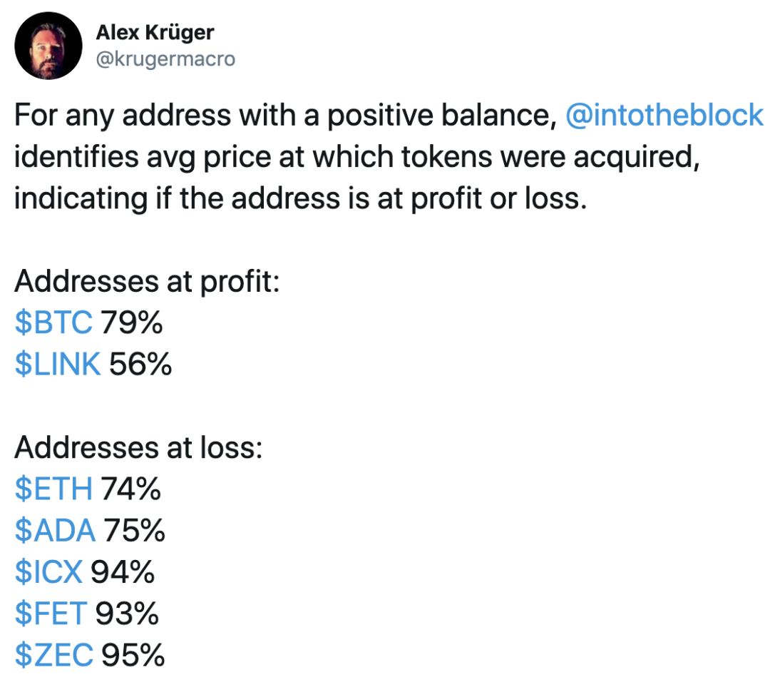 当然,以太坊不是最差的。加密货币交易员Alex Krüger在转发这组图片时补充了更多数据:目前大约95%的ZEC地址、94%的ICX地址、93%的FET地址、75%的ADA地址都处于亏损状态。它们的表现比以太坊更差。
