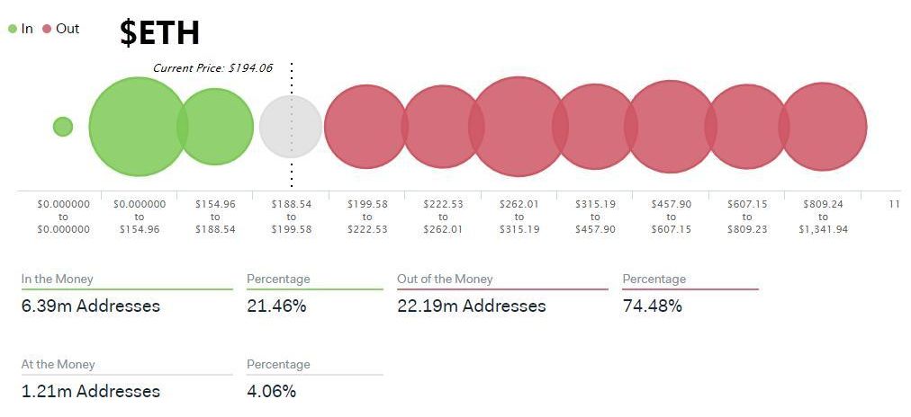 除了比特币,Into the Block还展示了以太坊持有者的盈亏情况。只是它的表现远不如比特币,超过74%的以太坊持有者处于亏损状态。