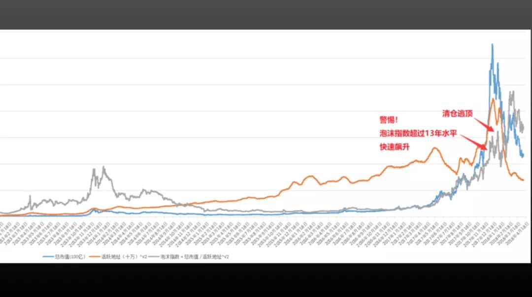 白话区块链:除了靠周期计算抄底,您还在 2017 年顶部成功逃顶,你说过逃顶比抄底更难,那是怎么做到的,今天能给我们介绍下吗?江卓尔:逃顶主要靠观察市场情绪,以及计算泡沫指数。我常用的有三个泡沫指数:
