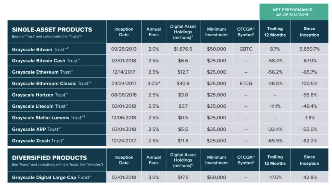 (截至2019年5月31日,灰度所发布的投资基金种类及每个基金所投资的产品)