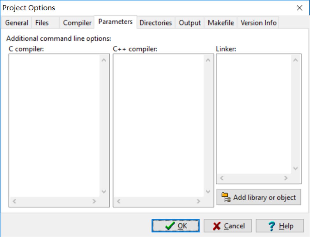 七、最后Project -> Project Options ->Parameters,将之前生成的.a文件也就是那个压缩包添加进来 一定要选择add library or object.