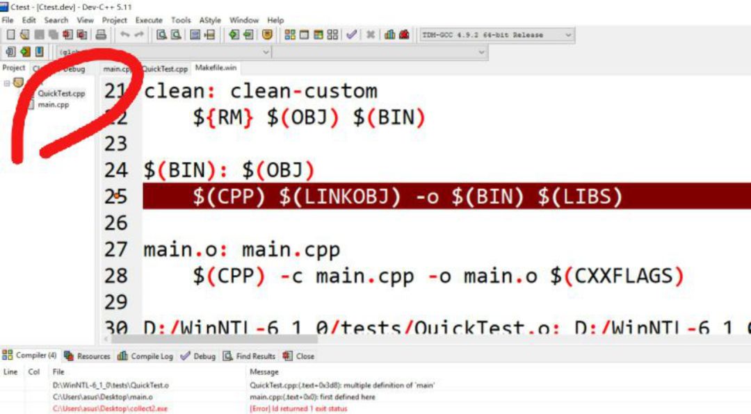 然后执行QuickTest。出现下面的错误情况时只要将空的main.cpp删除就可以执行成功了。