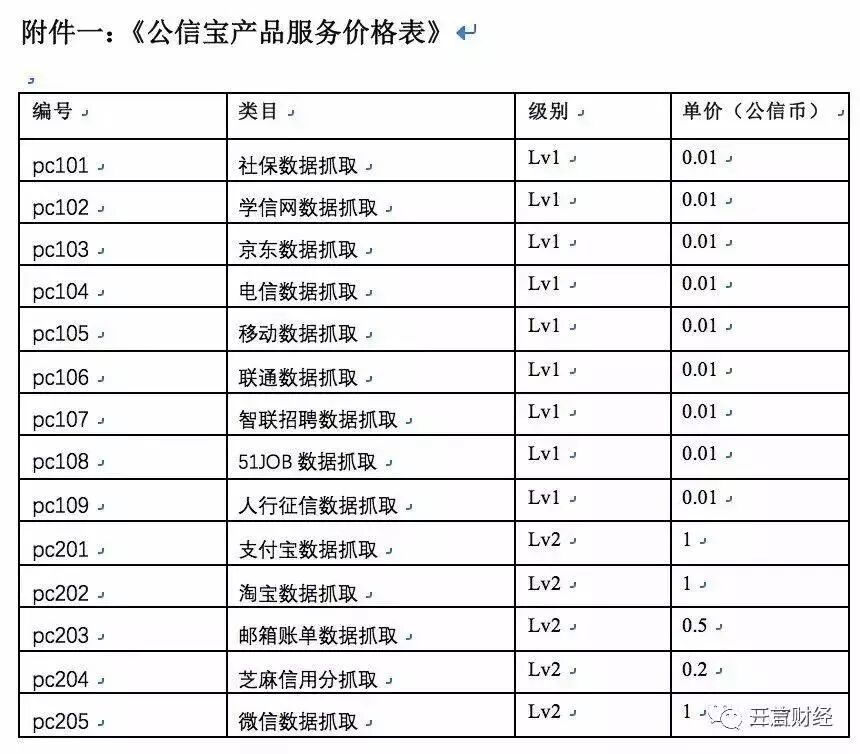 图片来源:开放财经在一份2018年的产品价格服务表中,公信宝介绍了其爬虫类数据类型涵盖社保、学信网、京东、电信、移动、联通、智联招聘、芝麻信用分、微信、支付宝,甚至是人行征信数据,等等。