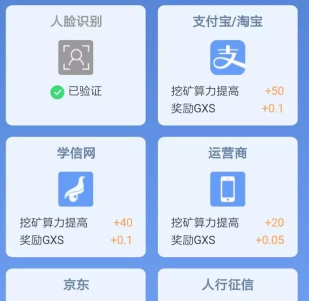 在布洛克城平台,用户提交自己的支付宝、学信网、运营商通话详单乃至人行征信信息,都可以提升“挖矿算力”,并直接获得GXS奖励。