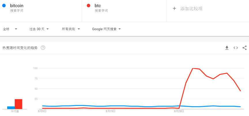从过去30天全球范围内的比特币相关关键词搜索量来看,“btc”的搜索热度有所降温,但仍保有关注度。