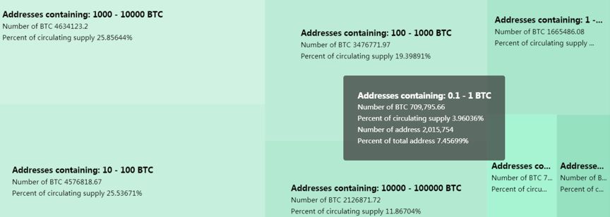 即持有0.1-1个比特币的地址数量,目前比特币小额地址数为201.5万。通常情况下,小额地址数的快速增长可以作为验证牛市行情真伪和长短的指标之一。
