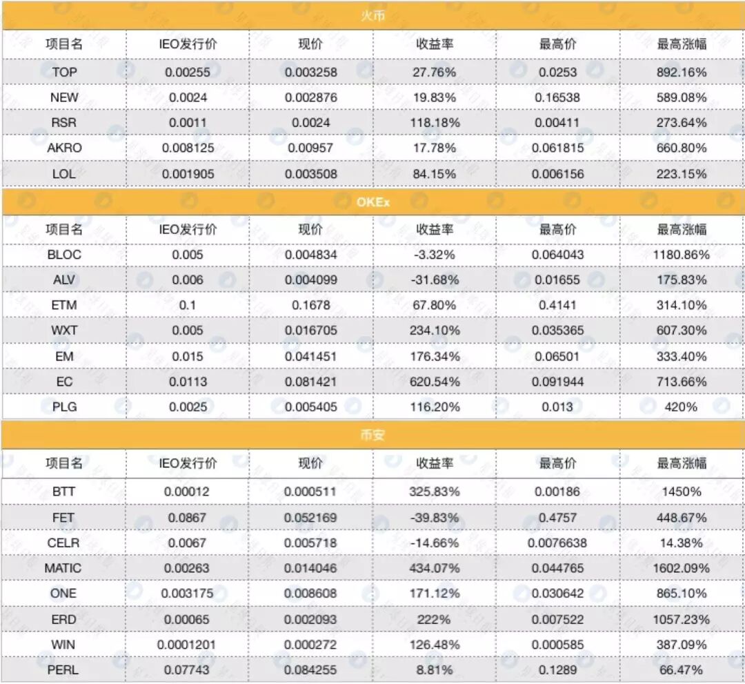 (注:数据统计日期截止至9月6日)Odaily星球日报统计了截至 9 月 6 日中午,火币、币安、OKEx 三大交易所的每期 IEO 收益率情况及最高涨幅。经统计后发现,币安、OKEx 的 IEO 收益率波动比较明显,不仅有跌破 IEO 发售价的情况,收益率也多超过 100%。火币 5 期 IEO 项目收益率反而情况相对稳定,现收益率暂未出现跌破 IEO 售价的情况。但在收益上,其仅 RSR 项目收益率超过 100%,LOL 超过 80%,其余项目收益多稳定在 10% 至 30% 之间。数据显示,火币 IEO 投资回报率仅32%,表现平平。IEO 之所以备受关注,还是源于其在熊市中带来的五倍、十倍的造富效应。不同于普上币,大多数人都默认,IEO 的本质是用来赚钱的。“IEO 项目也没人关注项目本身如何,能不能赚到钱才是核心问题。” 一位长期研究平台币的分析师在分析过三大交易所的各个 IEO 项目后得出观点:火币的 IEO 项目在二级市场的做市能力不太行。项目方的做市能力会直接反馈到币价上,IEO 的币价则将直接影响交易所的口碑。“但如果只关注二级市场做市能力,背调上做的不行,发现不了项目方明显存在的劣势,例如团队背景造假、同时运作多个项目等等,就很有可能被友商抓住把柄疯狂对事件进行放大,这样的话肯定会对公众情绪造成影响,反而加大了其二级市场做市的难度。”上述分析师说道。存量用户不断收紧,投资者对于 IEO 的要求也越发苛刻。这样一来,IEO 很容易形成反面作用,销毁用户。因此,币圈需要新玩法破局,没落的 IEO,亟待救世主。但谁也不知道,把卖手机和 IEO 结合到一起的创新,究竟是一场力挽狂澜的救赎之行,还是濒死挣扎的荒唐之举。