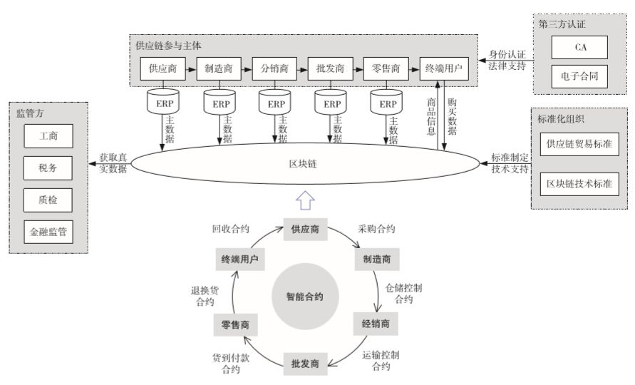 第三个是标准化组织,为整个供应链管理平台的运营制定标准,如供应链贸易标准、区块链技术标准;