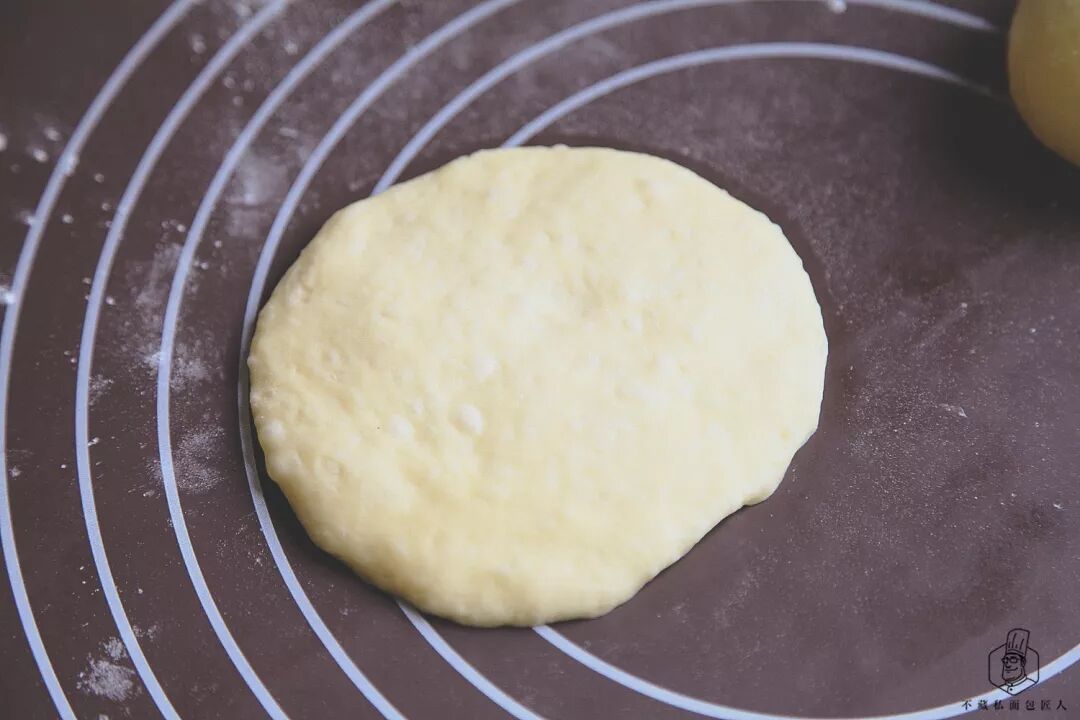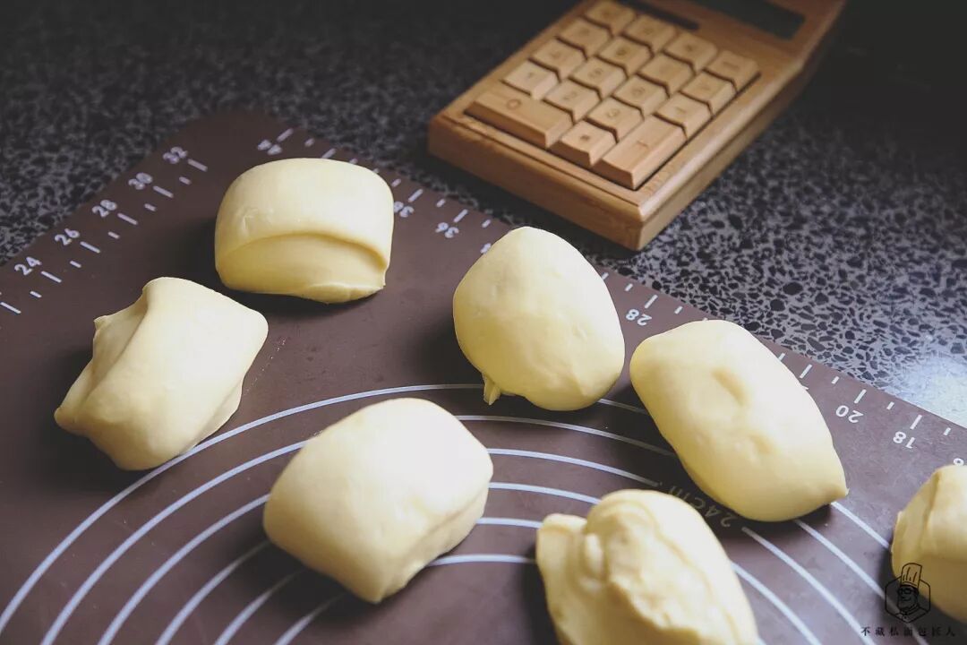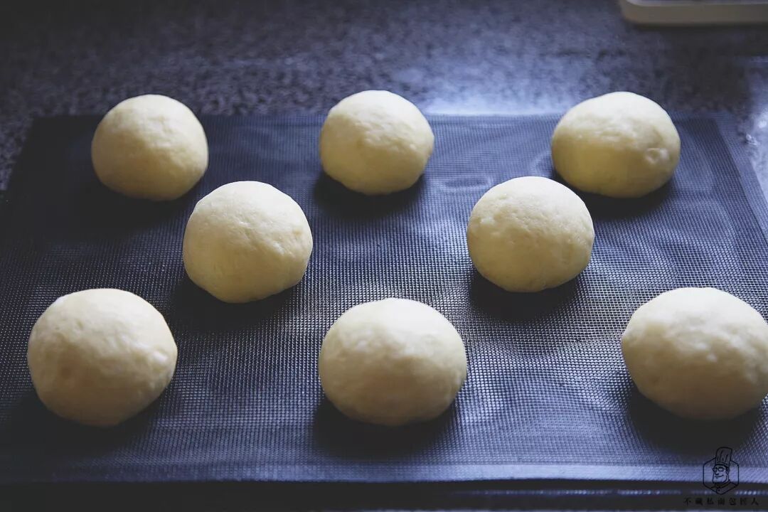 7、滚圆。室温醒发15分钟后,拿出一个,光滑面向上,用手掌按扁。