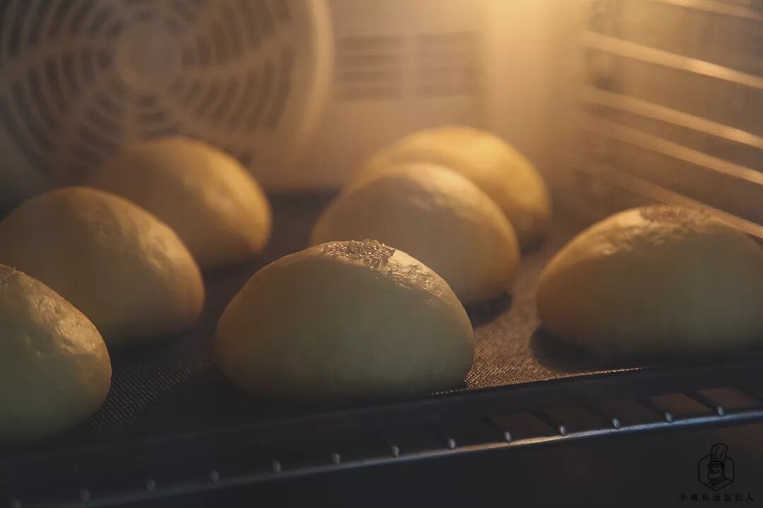9、8个面团依次包好,放在烤盘上。温度30℃,湿度80%,最终发酵40分钟。