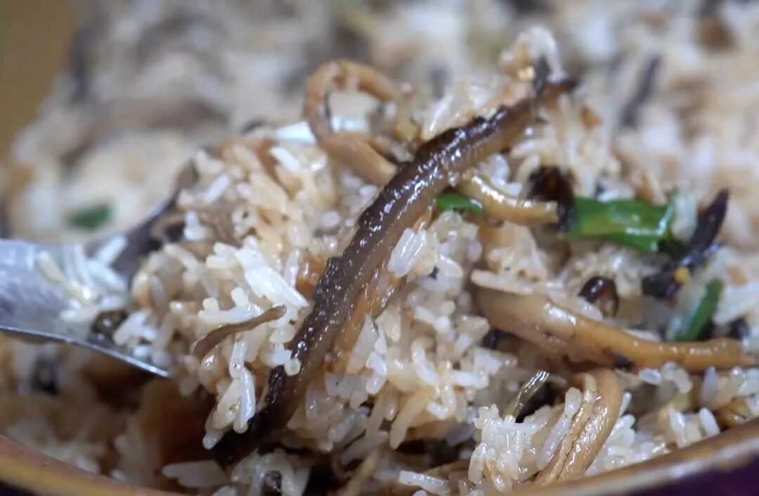 煲仔饭里的黄鳝是比较粗的,而台山黄鳝饭,要选不足一指的小鳝鱼。可以看到颜色较深较大条的是鳝鱼背部的肉、浅色薄薄一层是鳝鱼白白的肚子,一丝丝黑色的鳝血已经在高温下断裂,不是很显眼。