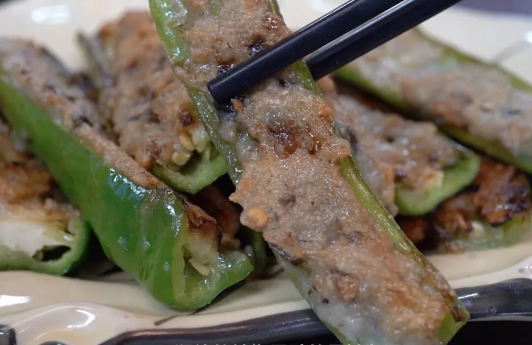 和在香港吃到的酿虾滑不同,顺德的辣椒里酿的是鲮鱼滑。青椒比较生,没怎么煎到。这样口感就比较脆,而且不会太油腻。